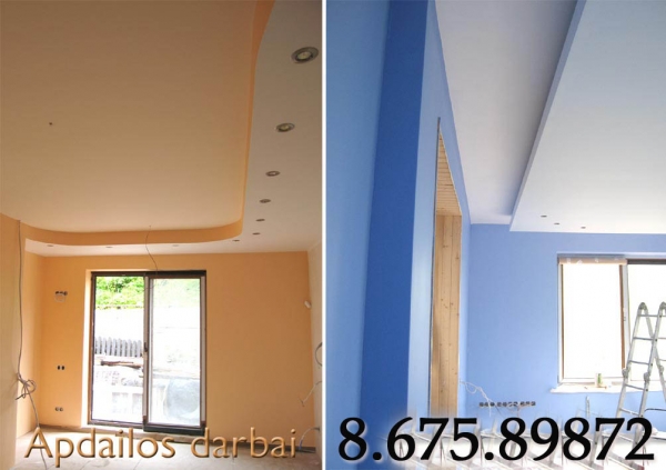 PILNA APDAILA . . . gkp montavimas. Paruosiam pagrinda, nuglaistom, nudazom, istapetuojam. Galim dirbt 1/5-se, negerentys su patirtim. Jei skubu, galim dirbt ir iseiginem d. Galim atlikt pilna buto- namo remonta, nes bendraujam su Santechnikais, Elektrikais, Plyteliu klojikais, Tinkuotojais. Todel imanomas geras darbu koordinavimas ir gera darbo kokybe. Turiu sutarciu su statybiniu medziagu gamintojais , prekiautojais, todel imanomos nuolaidos, medziagu komplektavimas ir pristatymas i remontuojama objekta. Kainos atitinkancios finansines krizes laikmeti.